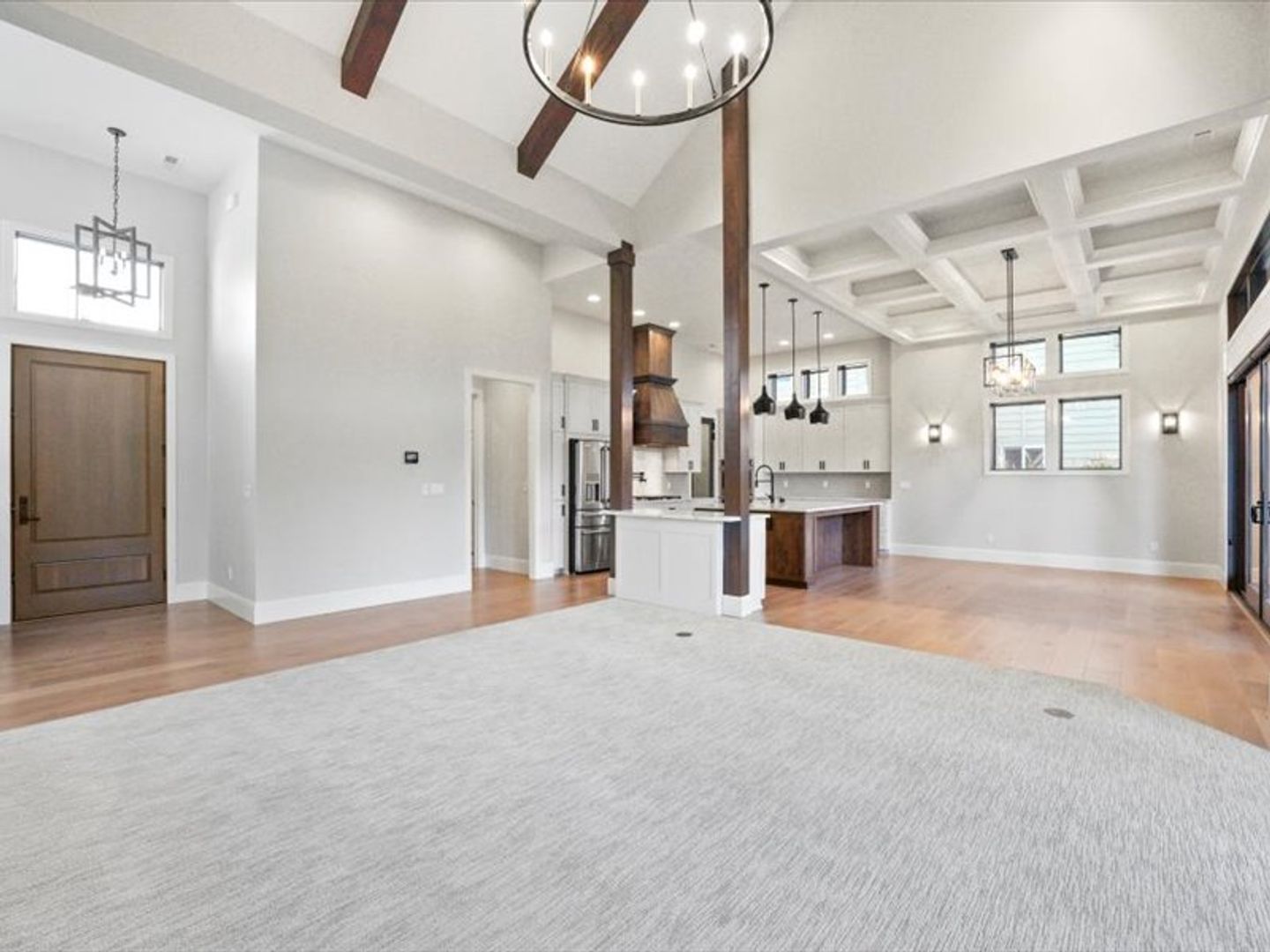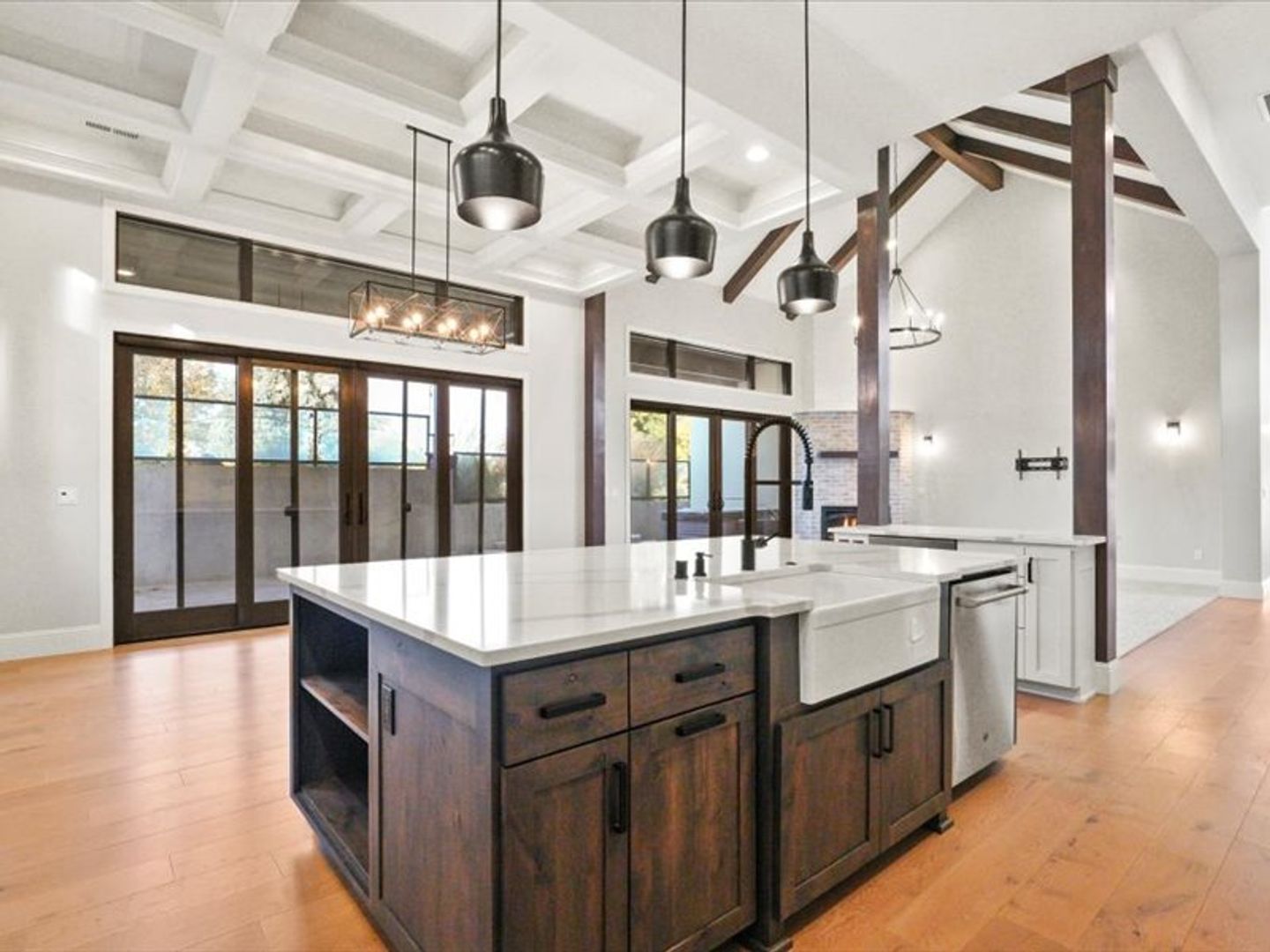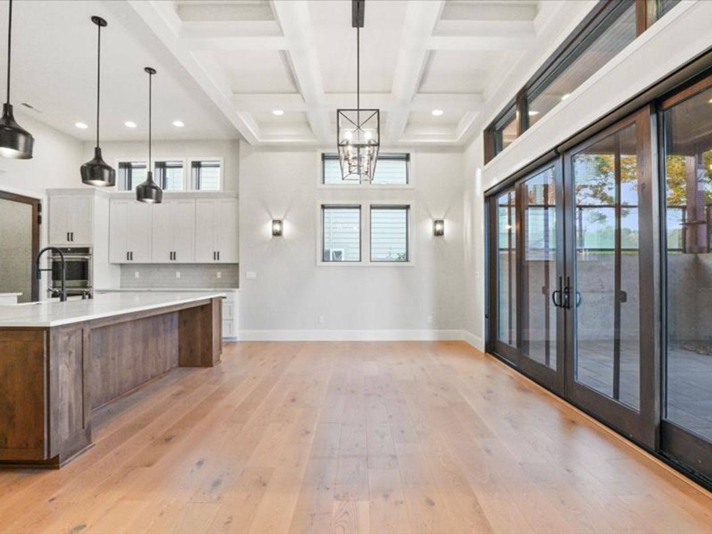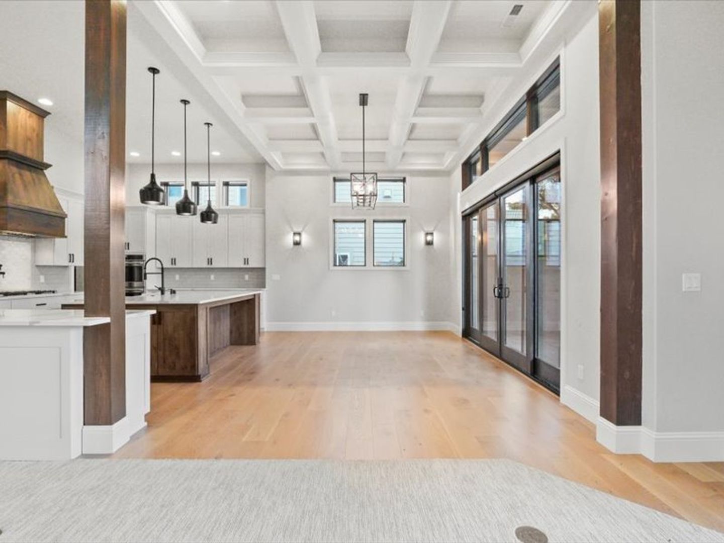 Step inside to an open-concept living area bathed in natural light, with soaring 20' wood beamed ceilings. Gleaming white oak floors flow seamlessly into the kitchen and dining area, featuring coffered ceilings and expansive sliding glass doors leading to your private patio.