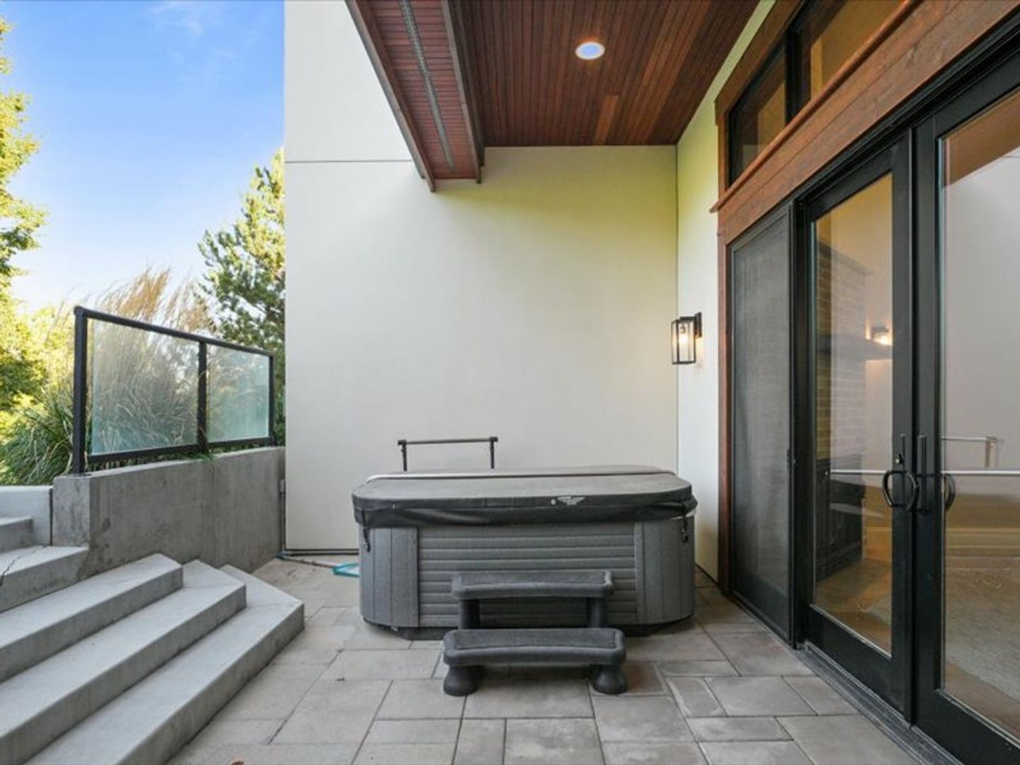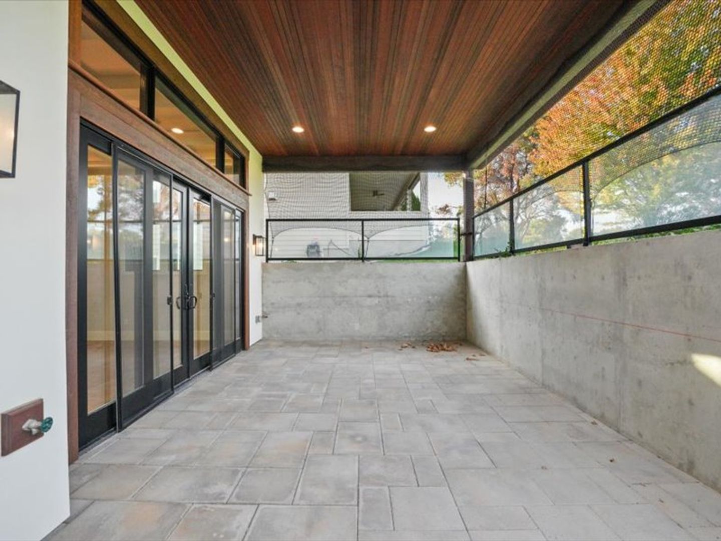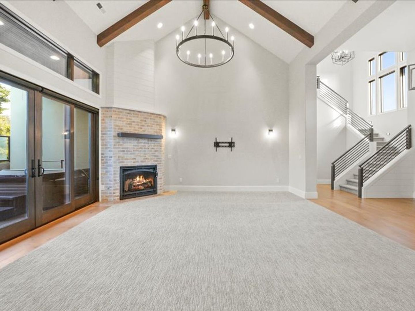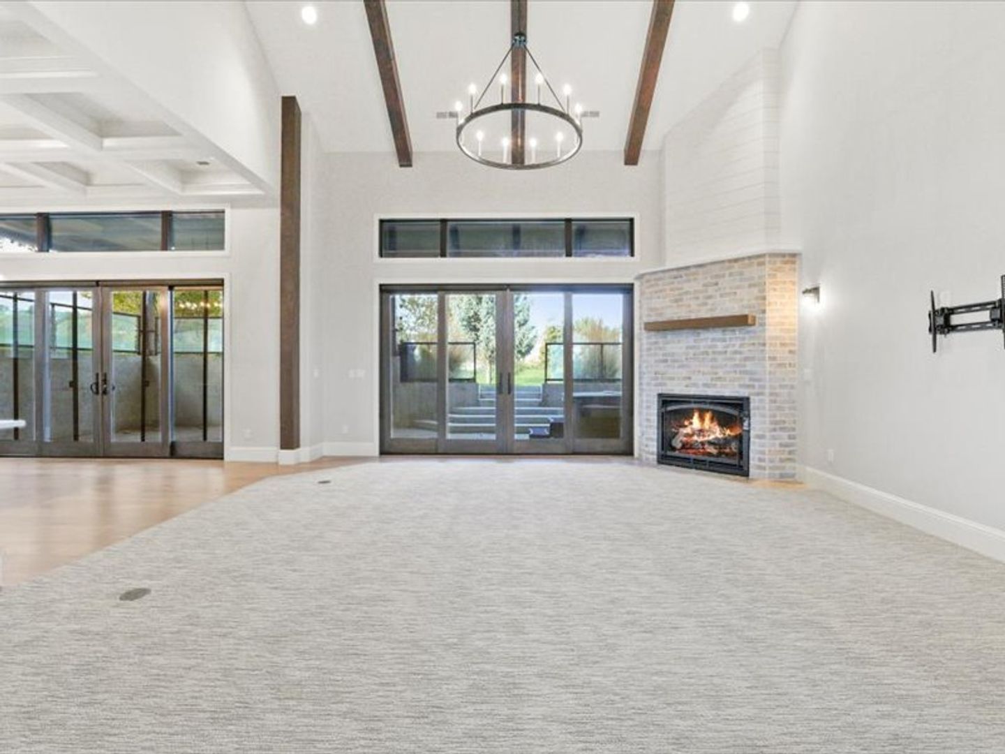 Step inside to an open-concept living area bathed in natural light, with soaring 20' wood beamed ceilings. Gleaming white oak floors flow seamlessly into the kitchen and dining area, featuring coffered ceilings and expansive sliding glass doors leading to your private patio.
