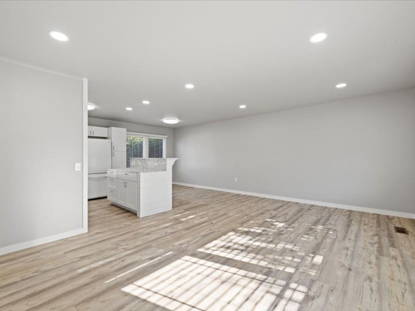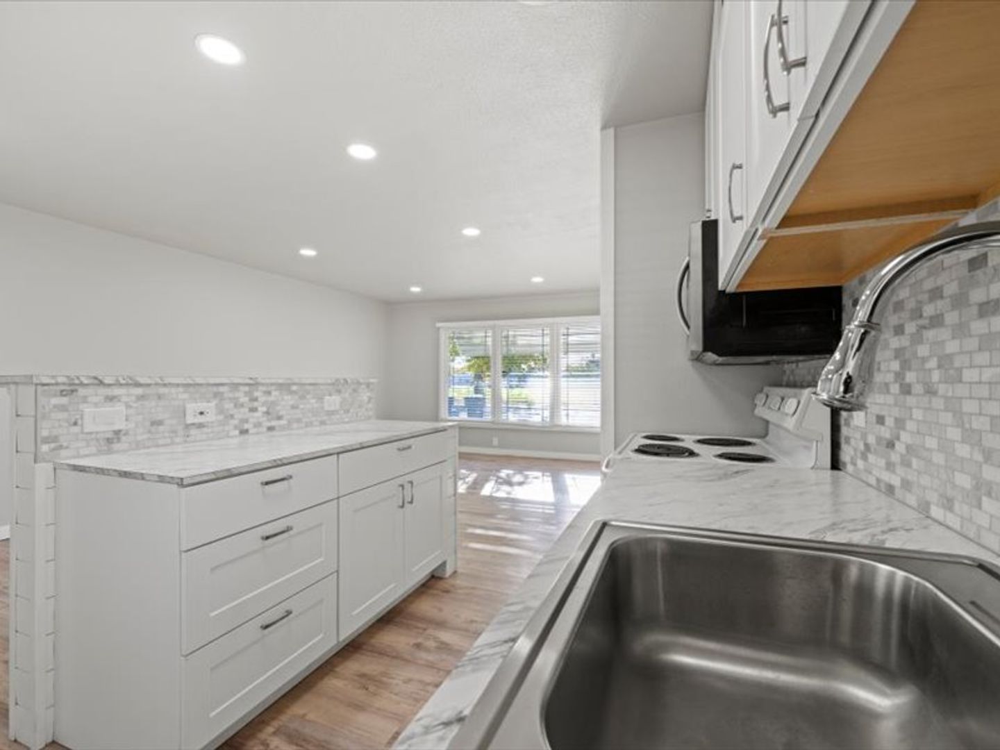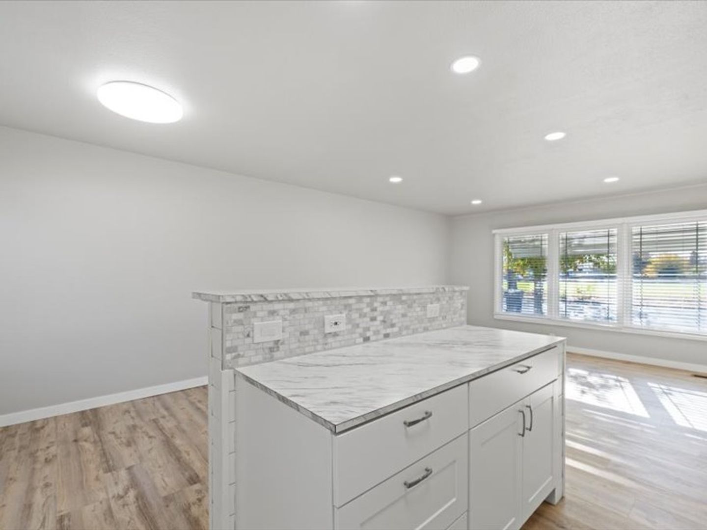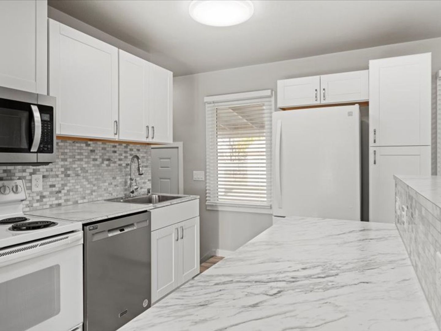 The heart of the home is the stunning open-concept kitchen, featuring a large center island/breakfast bar, a stylish backsplash, and brand-new cabinetry and countertops. The kitchen is fully equipped with major appliances, including a stove/oven, refrigerator, microwave, and dishwasher. The living area is bright and inviting, showcasing recessed lighting, a fresh gray paint palette, and beautiful new LVP flooring that extends throughout the main level. There is also a basement with the third bedroom and the washer/dryer hook ups.